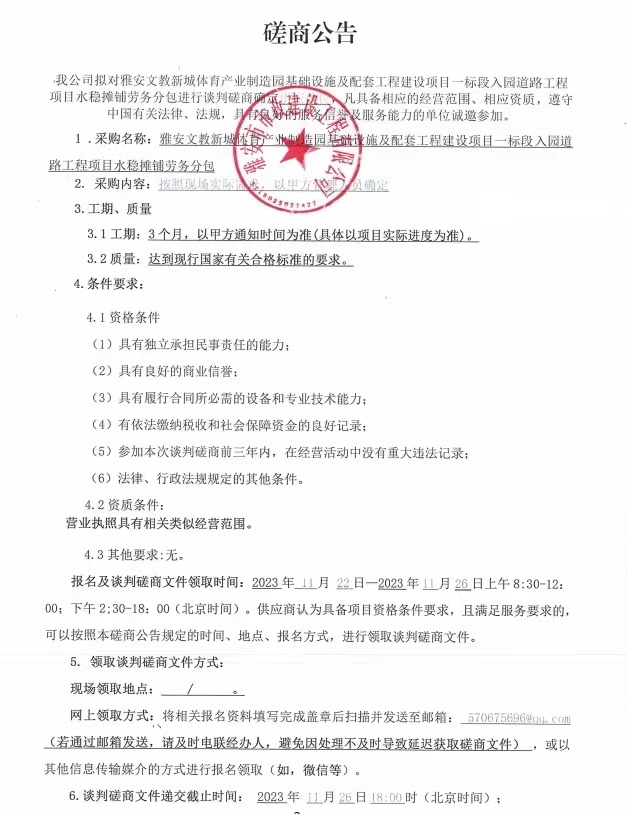 雅安文教新城體育產業(yè)制造園基礎設施及配套工程建設項目一標段入園道路工程項目水穩(wěn)攤鋪勞務分包磋商公告