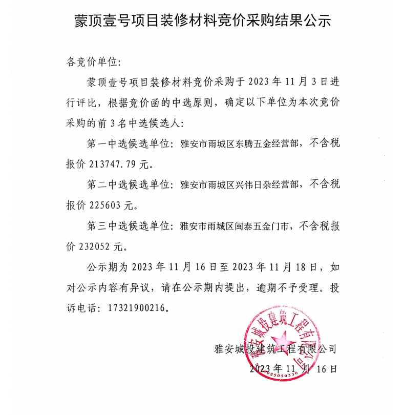 蒙頂壹號項目裝修材料競價采購結(jié)果公示
