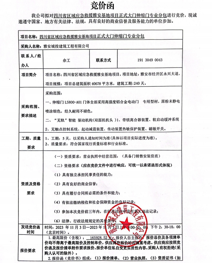 四川省區(qū)域應(yīng)急救援雅安基地項(xiàng)目正式大門(mén)伸縮門(mén)專(zhuān)業(yè)分包競(jìng)價(jià)公告