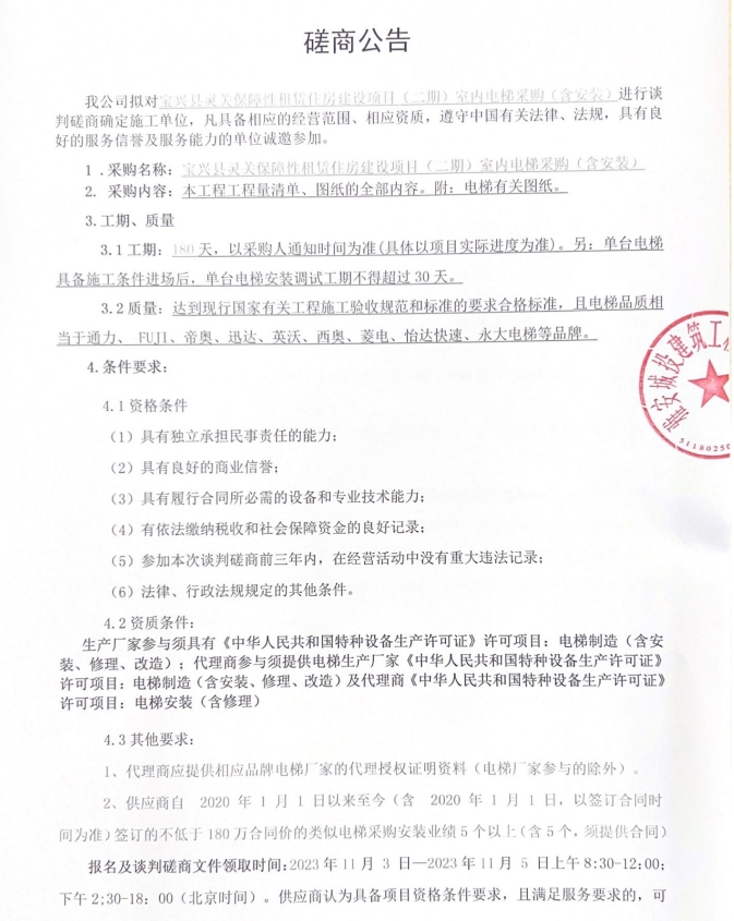 寶興縣靈關(guān)保障性租賃住房建設(shè)項目(二期)室內(nèi)電梯采購(含安裝)談判磋商公告