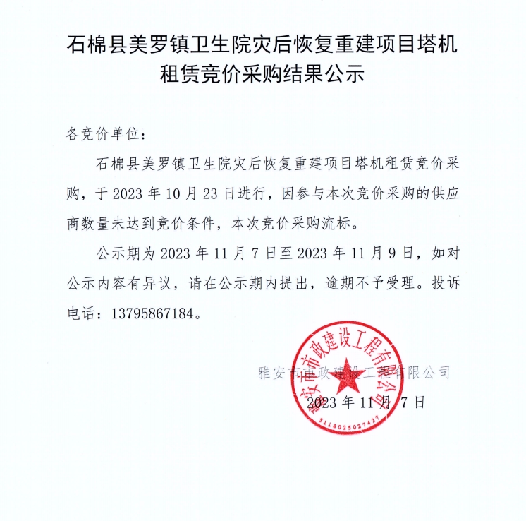 石棉縣美羅鎮(zhèn)衛(wèi)生院災(zāi)后恢復(fù)重建項(xiàng)目塔機(jī)租賃競價采購結(jié)果公示