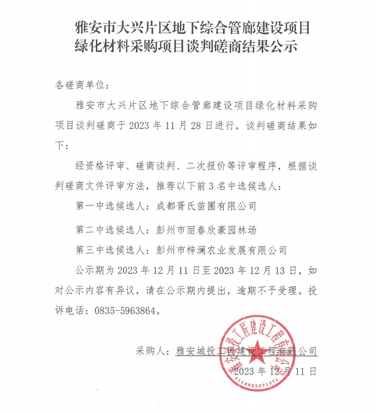 雅安市大興片區(qū)地下綜合管廊建設項目綠化材料采購項目談判磋商結果公示