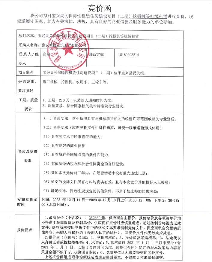 寶興靈關保障性租賃住房建設項目(二期)挖掘機等機械租賃競價公告