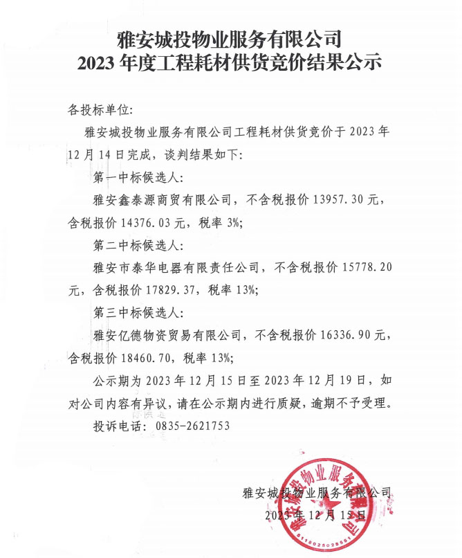 雅安城投物業(yè)服務(wù)有限公司2023年度工程耗材供貨競價結(jié)果公示