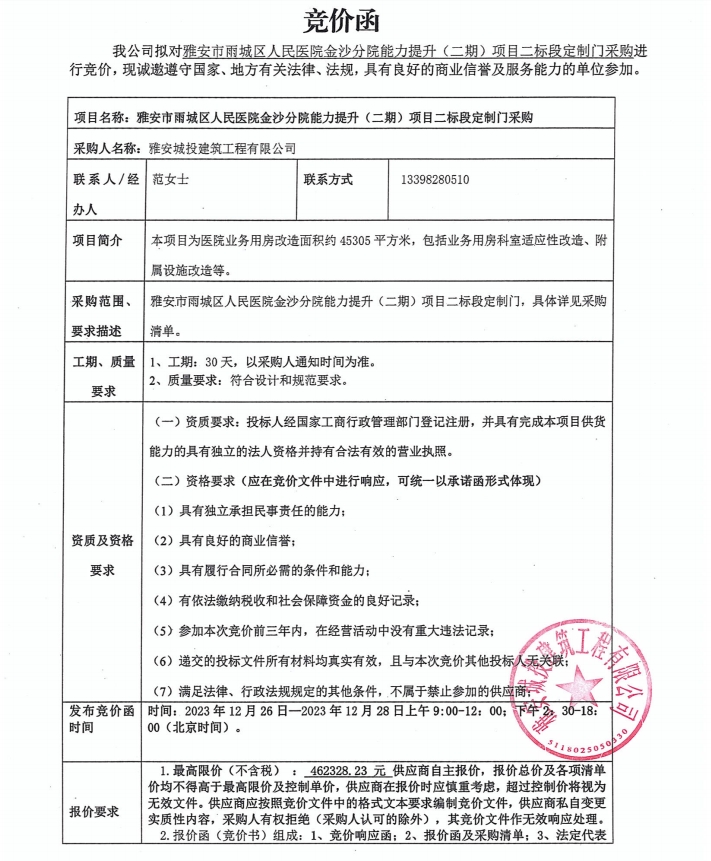 雅安市雨城區(qū)人民醫(yī)院金沙分院能力提升(二期)項(xiàng)目二標(biāo)段定制門采購競(jìng)價(jià)公告