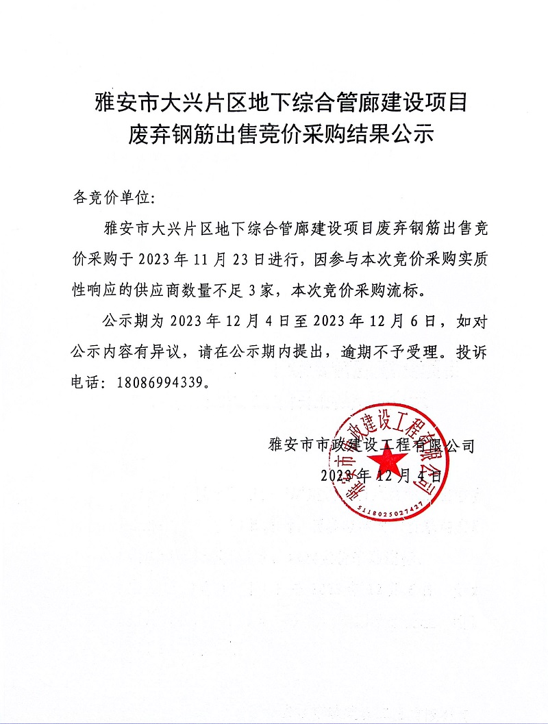 雅安市大興片區(qū)地下綜合管廊建設項目廢棄鋼筋出售競價采購結果公示