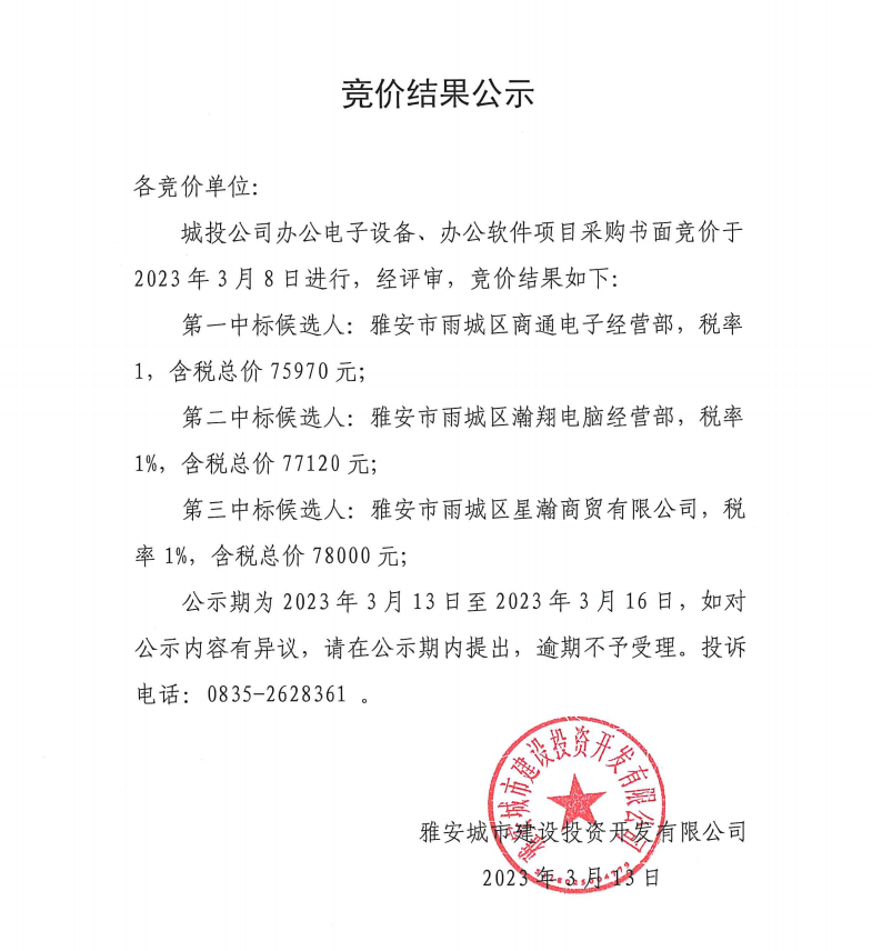 城投公司辦公電子設(shè)備、辦公軟件項(xiàng)目采購(gòu)競(jìng)價(jià)結(jié)果公示