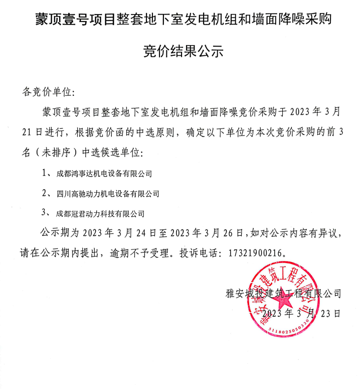 蒙頂壹號項目整套地下室發(fā)電機組和墻面降噪采購競價結果公示