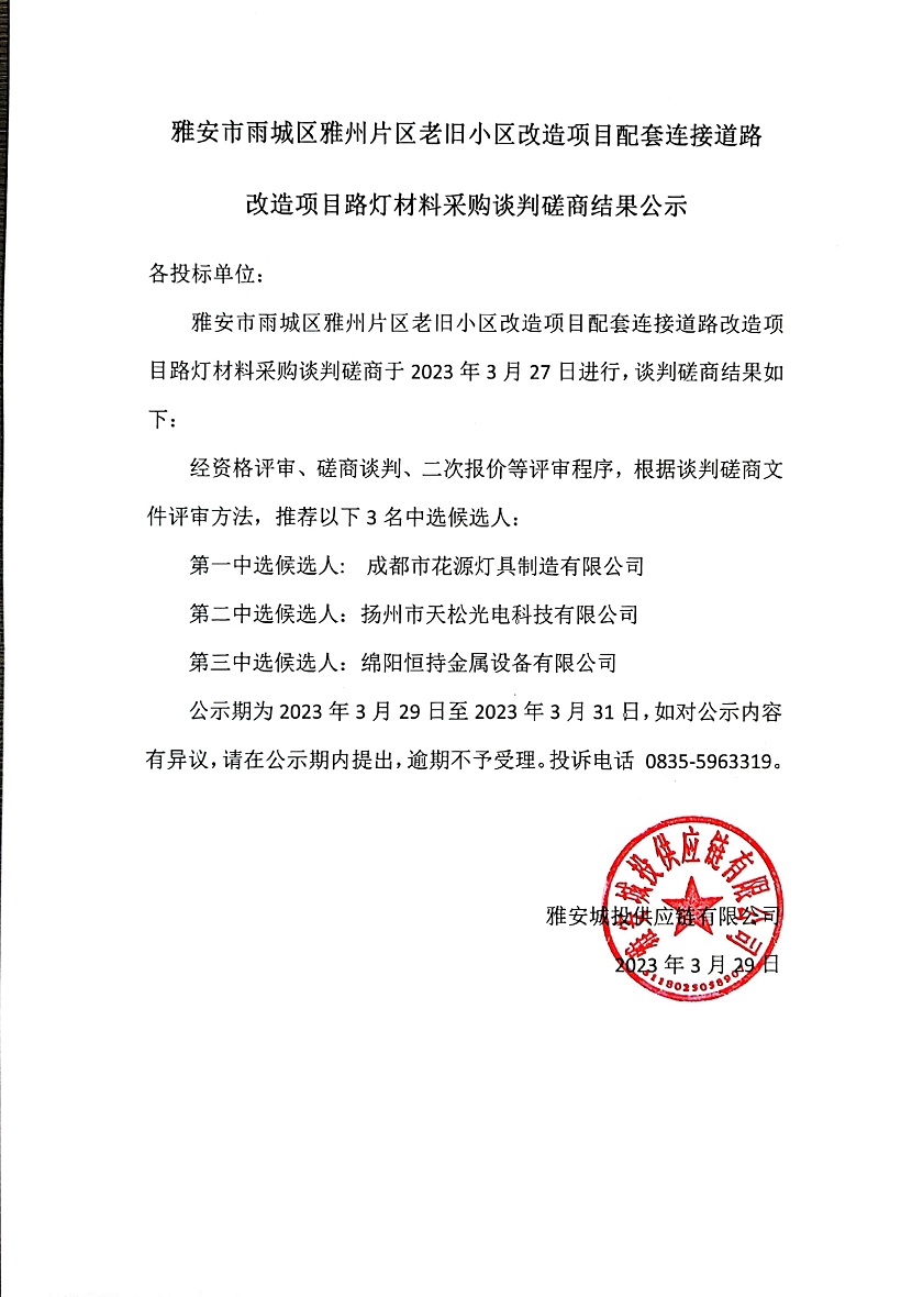 雅安市雨城區(qū)雅州片區(qū)老舊小區(qū)改造項目配套連接道路改造項目路燈材料采購談判磋商結果公示