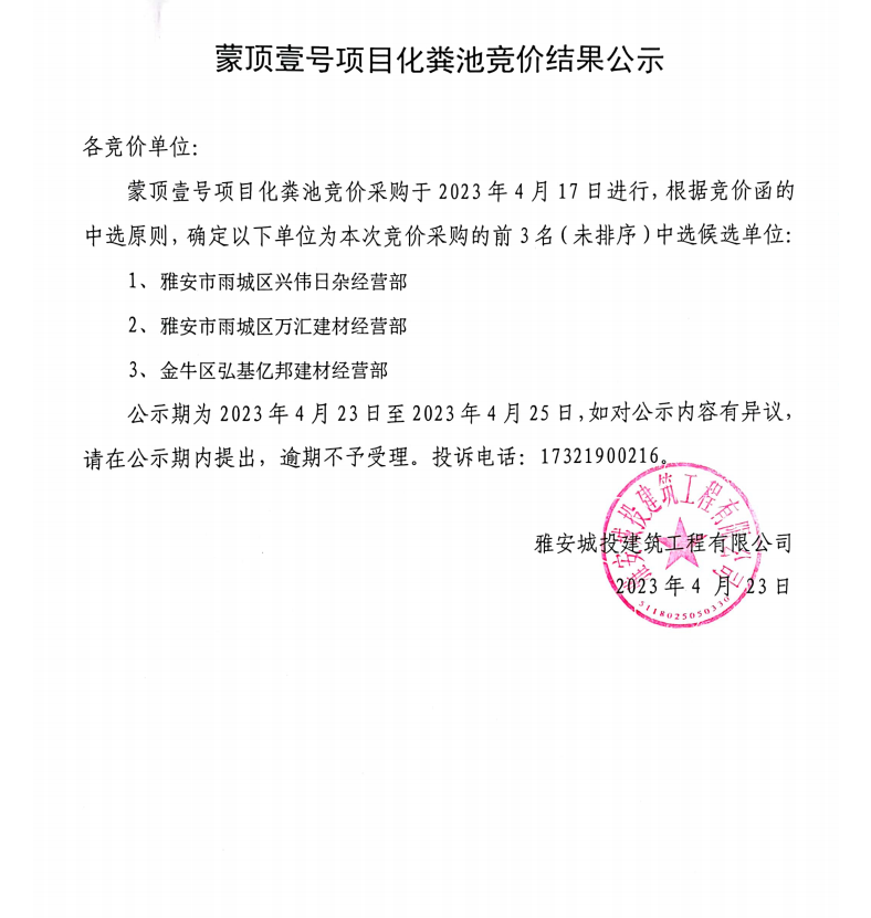 蒙頂壹號(hào)項(xiàng)目化糞池競價(jià)結(jié)果公示