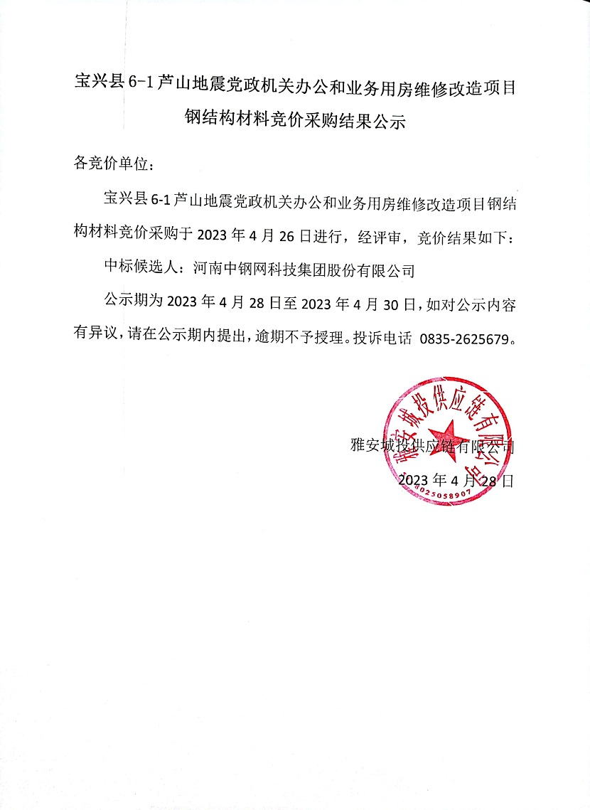 寶興縣6-1蘆山地震黨政機(jī)關(guān)辦公和業(yè)務(wù)用房維修改造項(xiàng)目鋼結(jié)構(gòu)材料競(jìng)價(jià)采購(gòu)結(jié)果公示