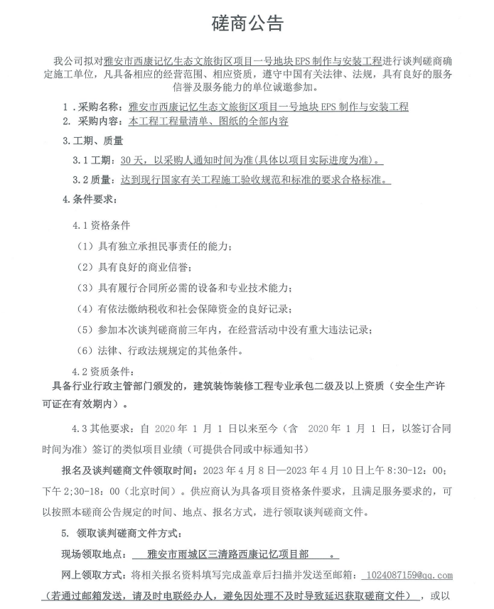 雅安市西康記憶生態(tài)文旅街區(qū)項(xiàng)目一號(hào)地塊項(xiàng)目EPS制作與安裝工程采購(gòu)談判磋商公告
