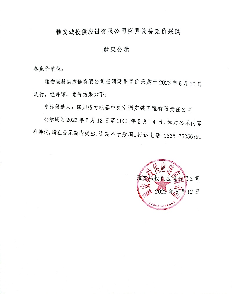 雅安城投供應鏈有限公司空調(diào)設備競價采購結果公示