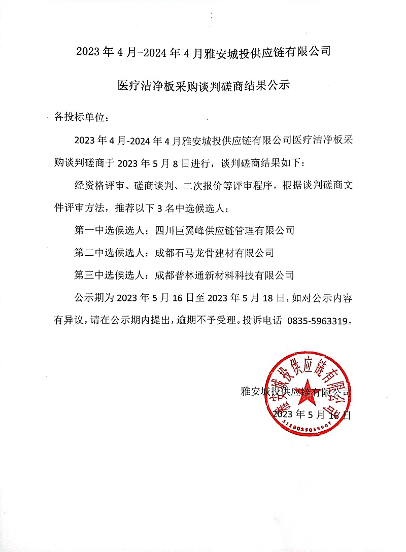 2023年4月-2024年4月雅安城投供應(yīng)鏈有限公司醫(yī)療潔凈板采購(gòu)談判磋商結(jié)果公示