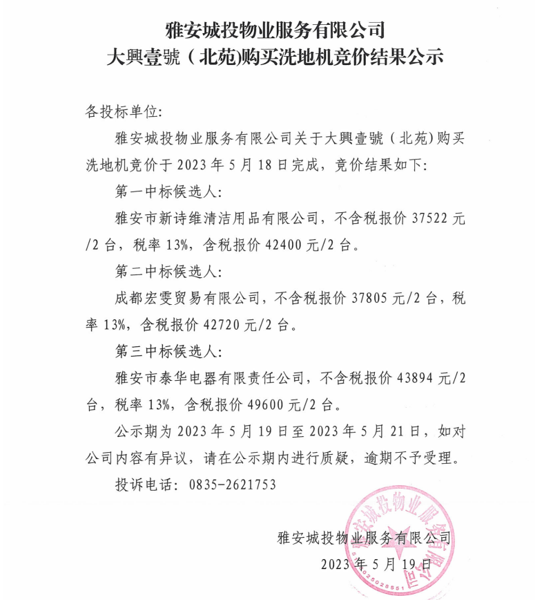 雅安城投物業(yè)服務(wù)有限公司大興壹號(hào)(北苑)購買洗地機(jī)競(jìng)價(jià)結(jié)果公示
