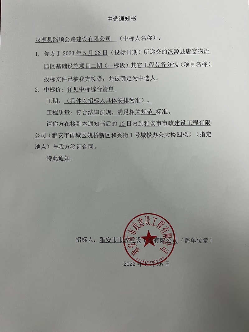 漢源縣唐富物流園區(qū)基礎設施項目二期(一標段)其它工程勞務分包中選通知書