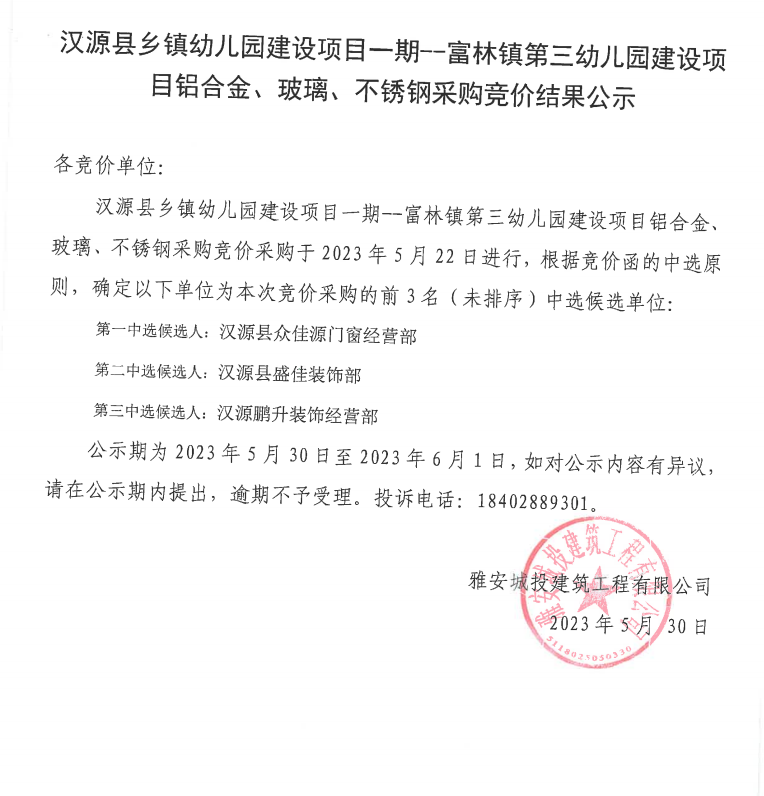 漢源縣鄉(xiāng)鎮(zhèn)幼兒園建設項目一期--富林鎮(zhèn)第三幼兒園建設項目鋁合金、玻璃、不銹鋼采購競價結果公示