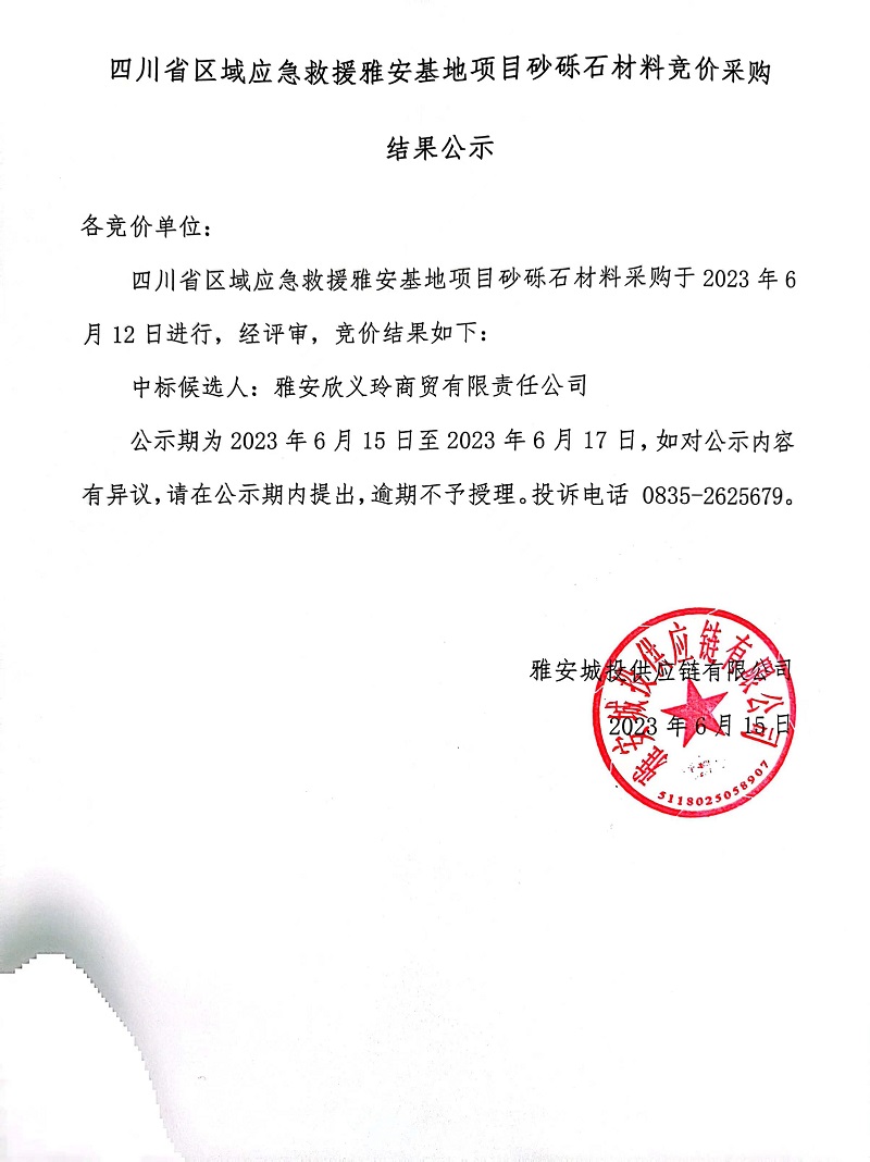 四川省區(qū)域應(yīng)急救援雅安基地項(xiàng)目砂礫石材料競價采購結(jié)果公示