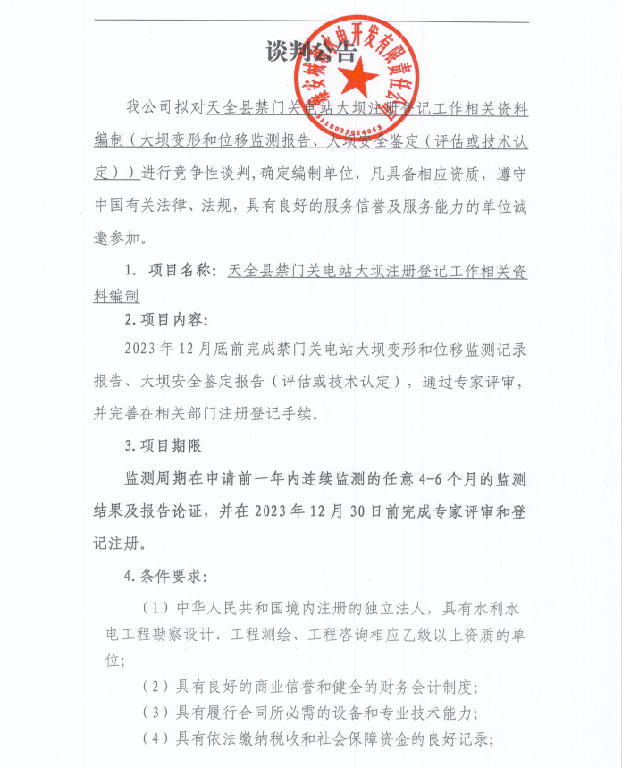 天全縣禁門(mén)關(guān)電站大壩注冊(cè)登記工作相關(guān)資料編制(大壩變形和位移監(jiān)測(cè)報(bào)告、大壩安全鑒定(評(píng)估或技術(shù)認(rèn)定))談判公告