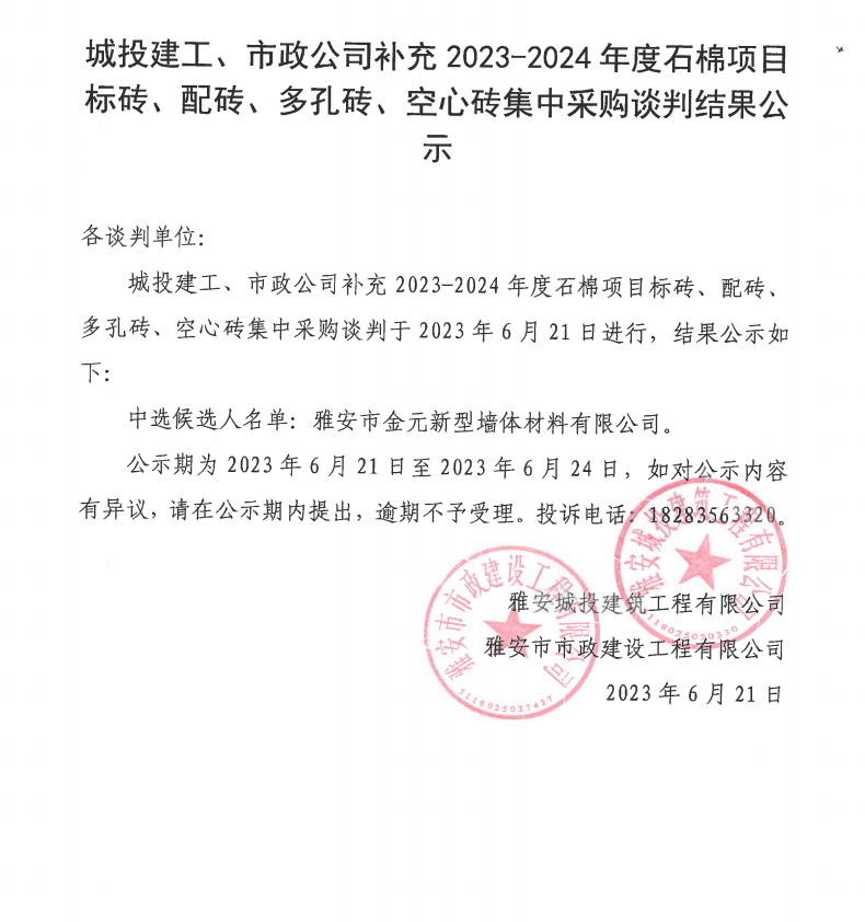 城投建工、市政公司補(bǔ)充2023-2024年度石棉項(xiàng)目標(biāo)磚、配磚、多孔磚、空心磚集中采購談判結(jié)果公示