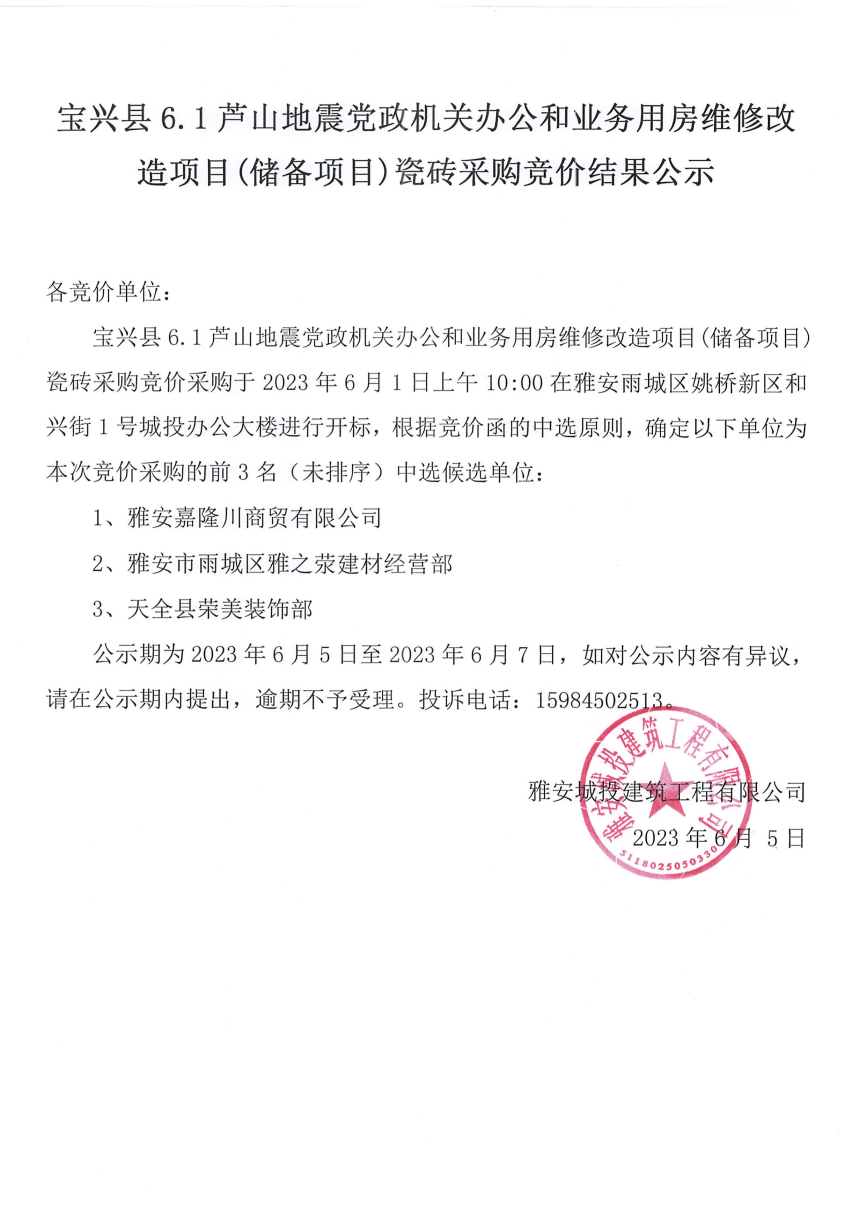 寶興縣6.1蘆山地震黨政機(jī)關(guān)辦公和業(yè)務(wù)用房維修改造項(xiàng)目(儲(chǔ)備項(xiàng)目)瓷磚采購競(jìng)價(jià)結(jié)果公示
