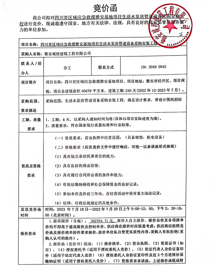 四川省區(qū)域應(yīng)急救援雅安基地項(xiàng)目生活水泵房管道設(shè)備采購(gòu)安裝工程競(jìng)價(jià)公告