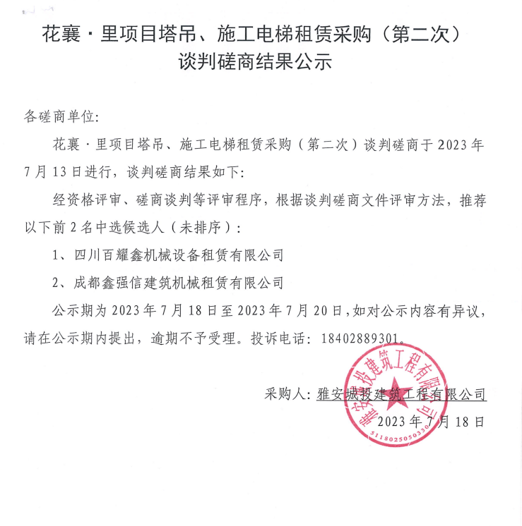 花襄·里項(xiàng)目塔吊、施工電梯租賃采購(第二次)談判磋商結(jié)果公示
