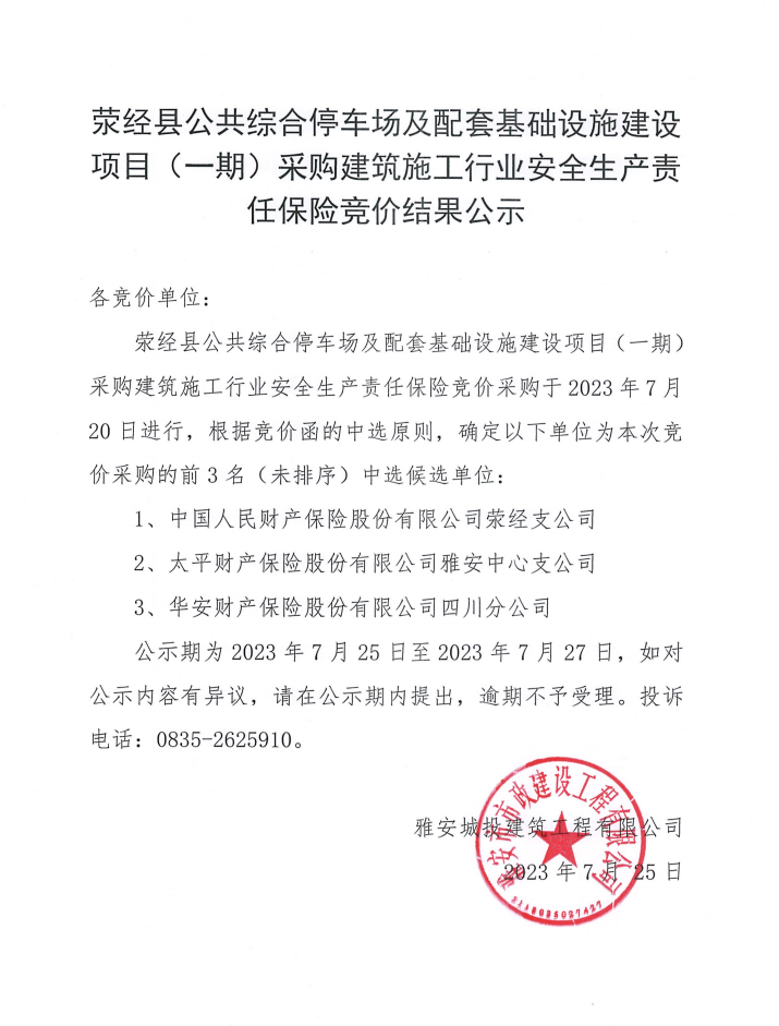 滎經(jīng)縣公共綜合停車場及配套基礎(chǔ)設(shè)施建設(shè)項(xiàng)目(一期)采購建筑施工行業(yè)安全生產(chǎn)責(zé)任保險(xiǎn)競價(jià)結(jié)果公示