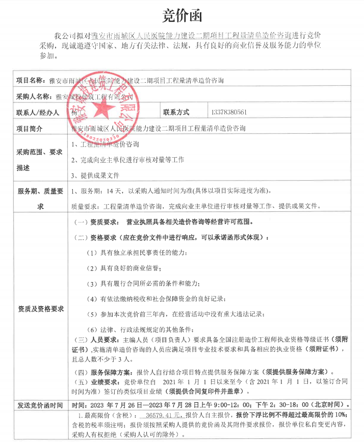 雅安市雨城區(qū)人民醫(yī)院能力建設(shè)二期項目工程量清單造價咨詢競價公告
