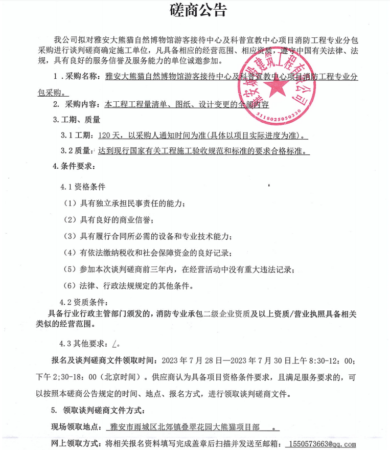 雅安大熊貓自然博物館游客接待中心及科普宣教中心項(xiàng)目消防工程專(zhuān)業(yè)分包采購(gòu)談判磋商公告