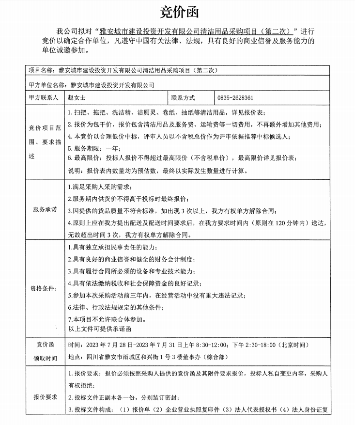 雅安城市建設(shè)投資開發(fā)有限公司清潔用品采購項(xiàng)目(第二次)競價(jià)公告