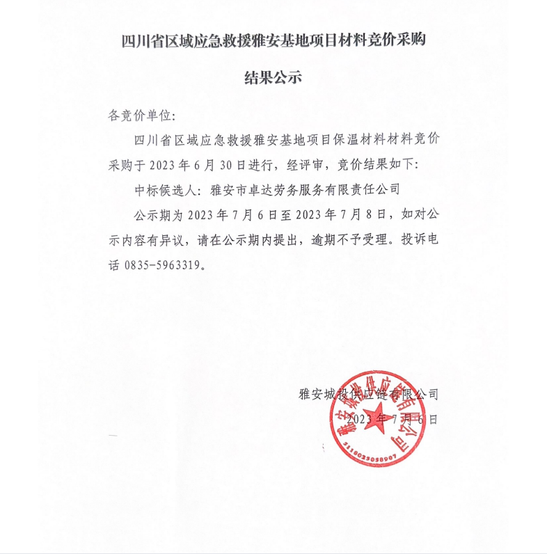 四川省區(qū)域應(yīng)急救援雅安基地項(xiàng)目材料競(jìng)價(jià)采購(gòu)結(jié)果公示