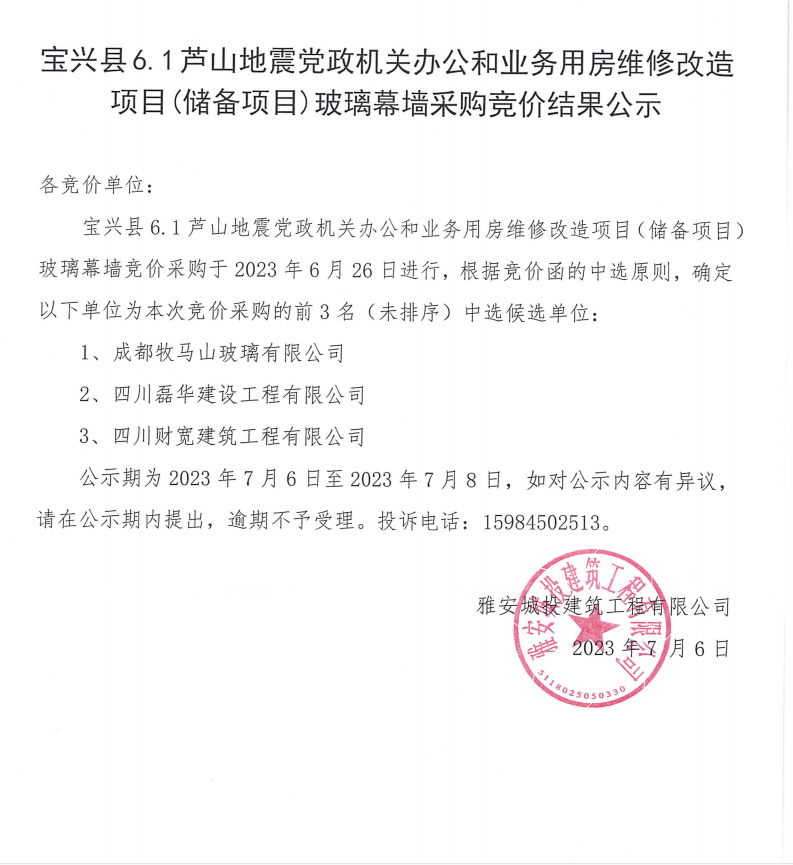 寶興縣6.1蘆山地震黨政機關辦公和業(yè)務用房維修改造項目(儲備項目)玻璃幕墻采購競價結(jié)果公示