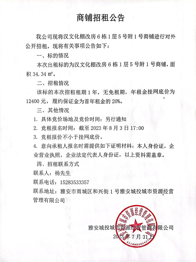 漢文化棚改房6棟1層5號附1號商鋪招租公告
