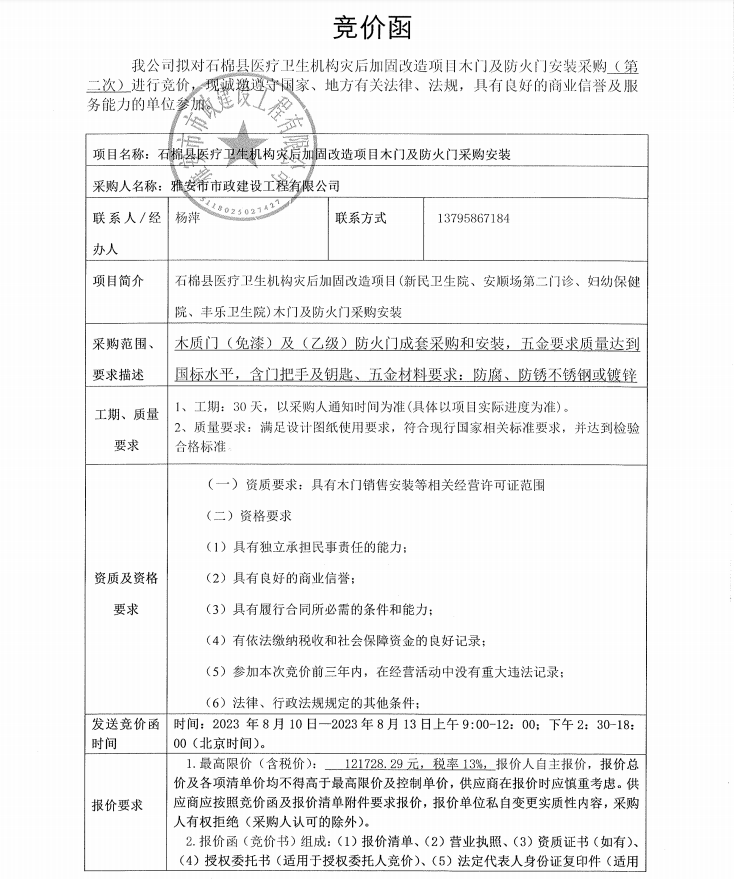 石棉縣醫(yī)療衛(wèi)生機(jī)構(gòu)災(zāi)后加固改造項(xiàng)目木門及防火門安裝采購(第二次)競價(jià)公告