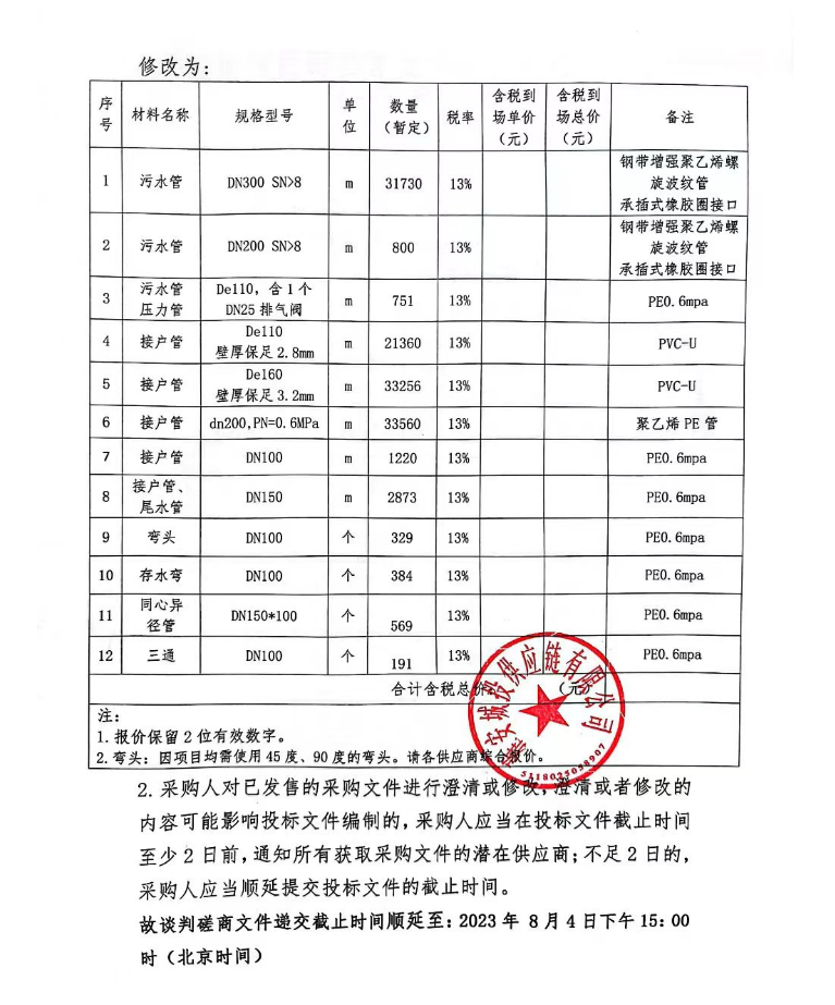 生活污水處理設(shè)施恢復(fù)重建項目管材材料采購補(bǔ)遺(一)
