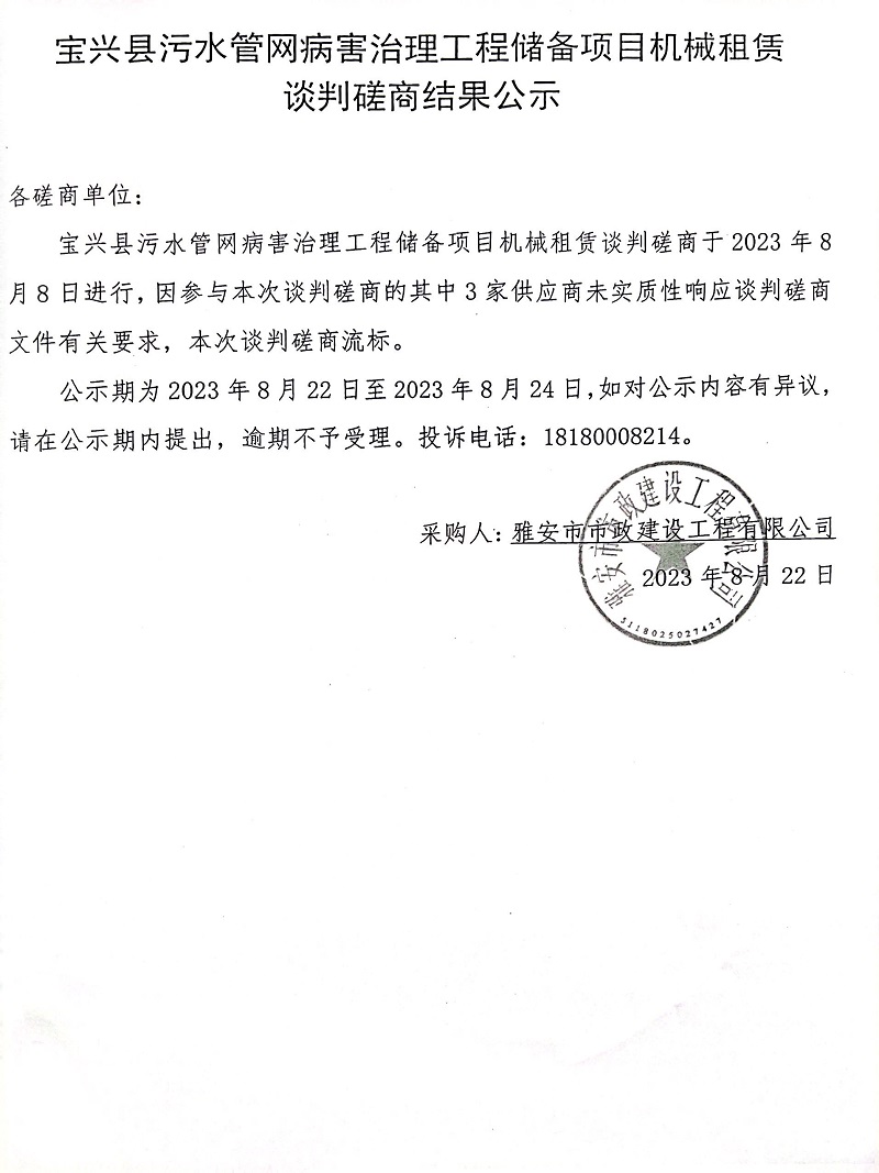 寶興縣污水管網病害治理工程儲備項目機械租賃談判磋商結果公示