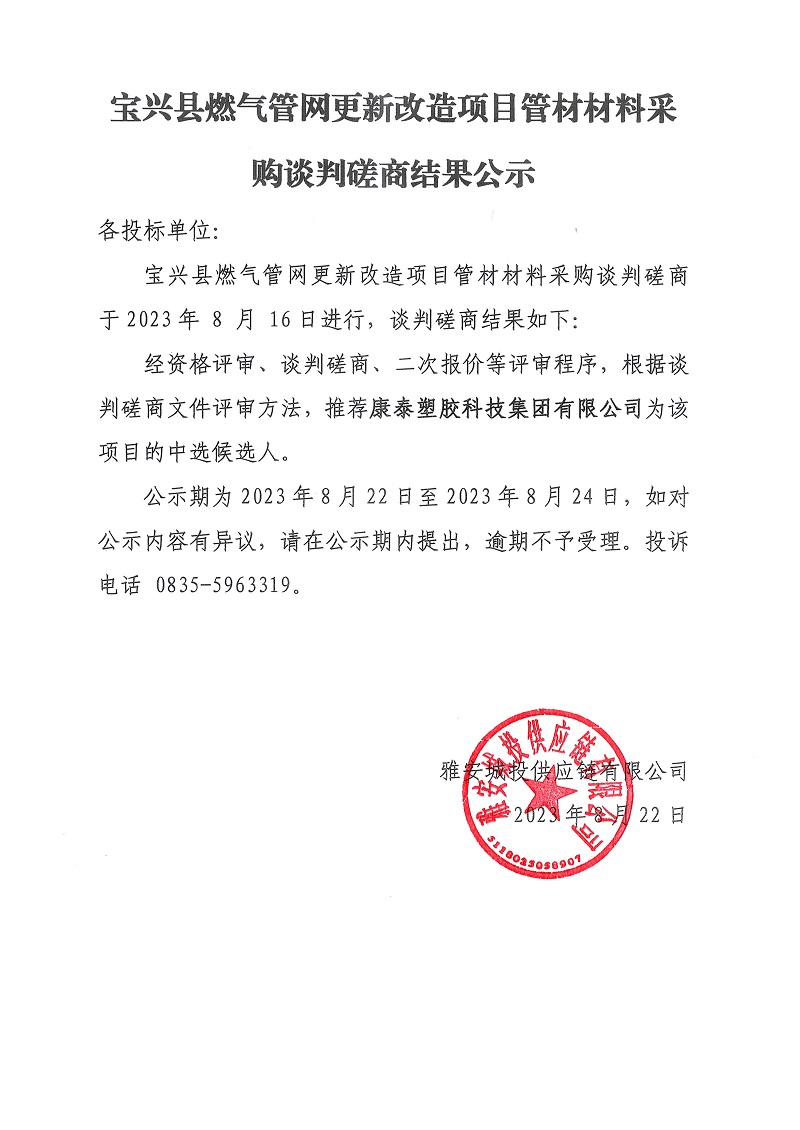 寶興縣燃氣管網(wǎng)更新改造項目管材材料采購談判磋商結(jié)果公示