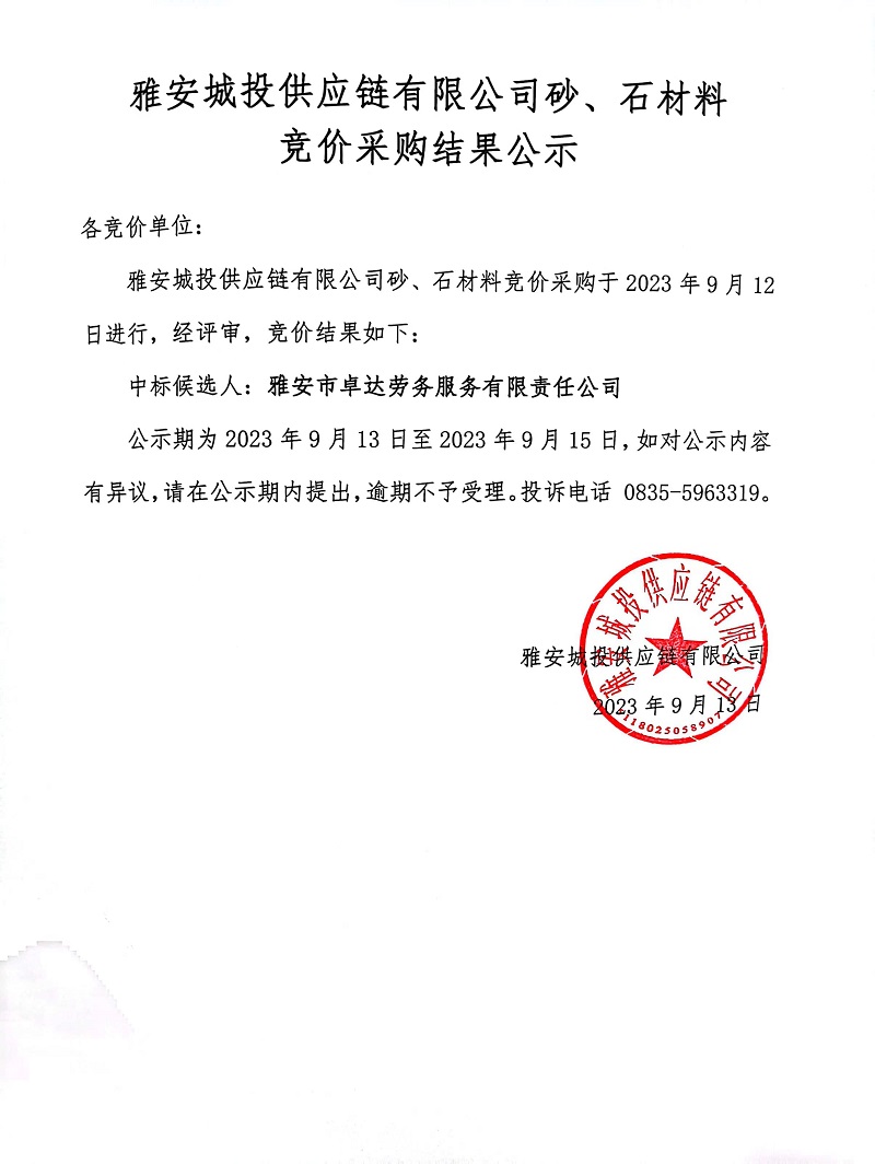 雅安城投供應(yīng)鏈有限公司砂、石材料競(jìng)價(jià)采購(gòu)結(jié)果公示