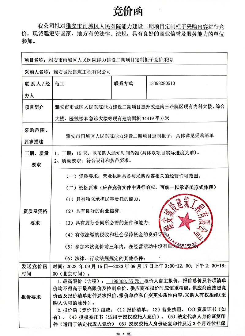 雅安市雨城區(qū)人民醫(yī)院能力建設二期項目定制柜子采購競價公告
