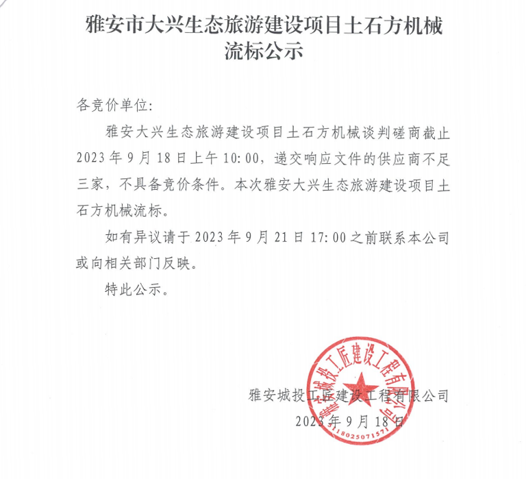雅安市大興生態(tài)旅游建設(shè)項(xiàng)目土石方機(jī)械流標(biāo)公示