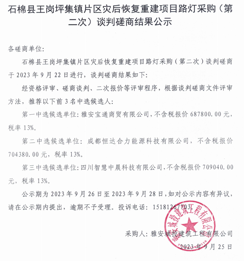 石棉縣王崗坪集鎮(zhèn)片區(qū)災(zāi)后恢復(fù)重建項(xiàng)目路燈采購(gòu)(第二次)談判磋商結(jié)果公示