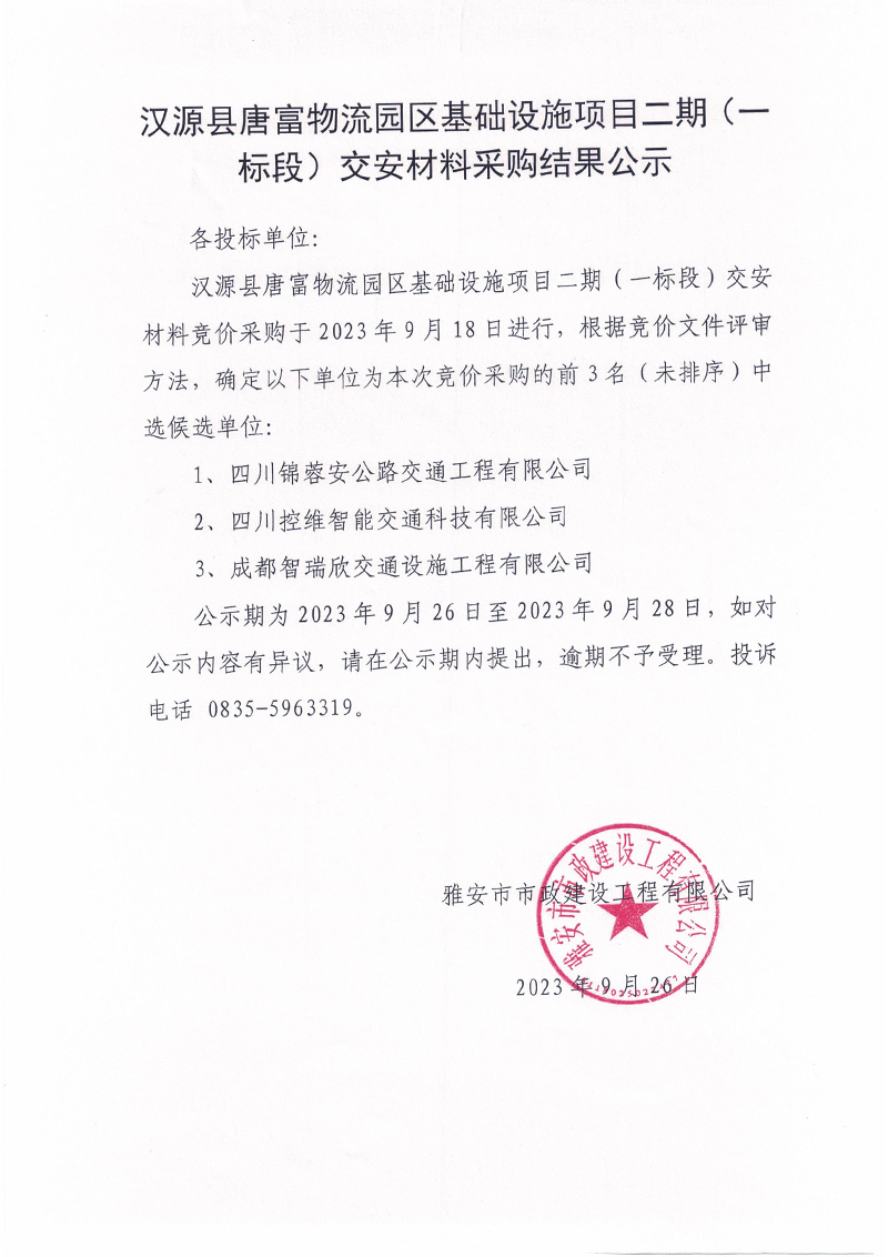 漢源縣唐富物流園區(qū)基礎(chǔ)設(shè)施項(xiàng)目二期(一標(biāo)段)交安材料采購(gòu)結(jié)果公示