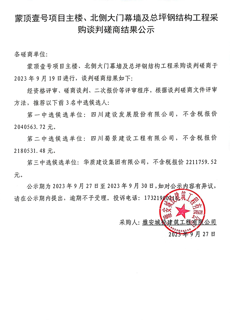 蒙頂壹號(hào)項(xiàng)目主樓、北側(cè)大門幕墻及總坪鋼結(jié)構(gòu)工程采購(gòu)談判磋商結(jié)果公示