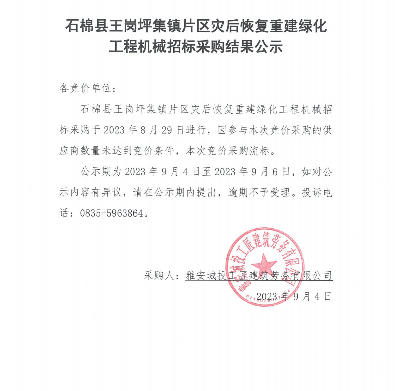 石棉縣王崗坪集鎮(zhèn)片區(qū)災(zāi)后恢復(fù)重建綠化工程機(jī)械招標(biāo)采購(gòu)結(jié)果公示