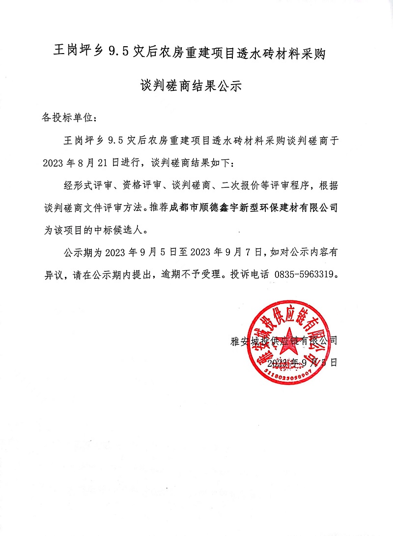王崗坪鄉(xiāng)9.5災后農房重建項目透水磚材料采購談判磋商結果公示