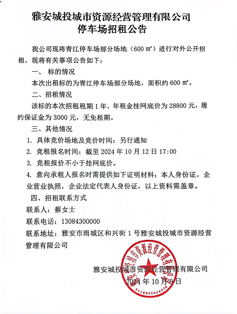 雅安城投城市資源經(jīng)營管理有限公司關(guān)于青江停車場部分場地招租的公告