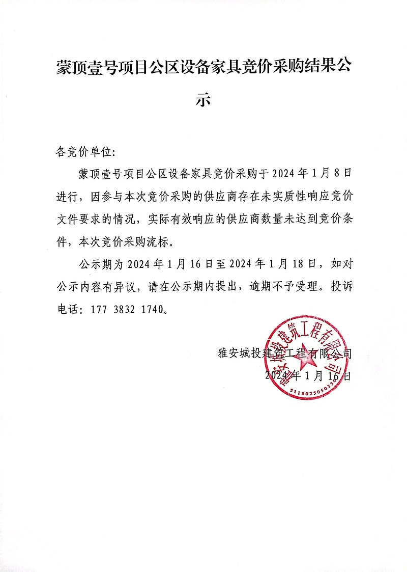 蒙頂壹號項目公區(qū)設備家具競價采購結果公示