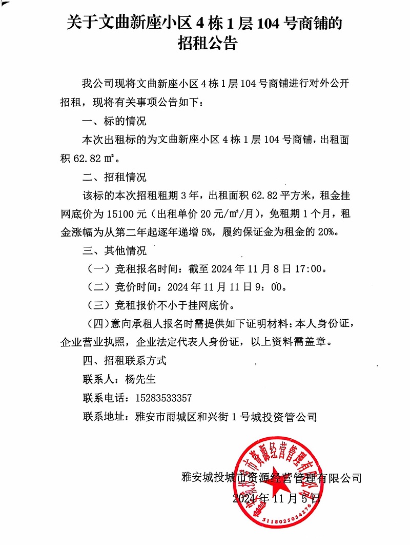 關(guān)于文曲新座小區(qū)4棟1層104號(hào)商鋪的招租公告