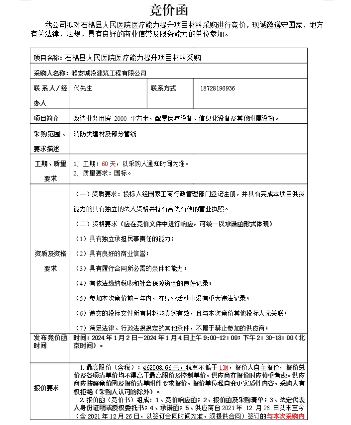 石棉縣人民醫(yī)院醫(yī)療能力提升項(xiàng)目消防材料(二次)采購(gòu)競(jìng)價(jià)公告